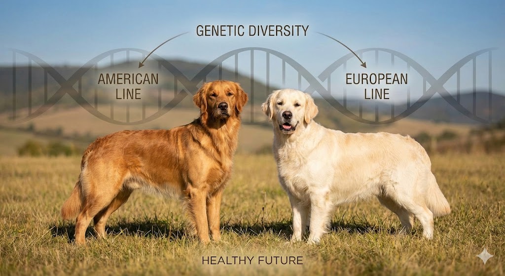 私たちは、遺伝的に豊かで活力あるゴールデンレトリバーの血統継承を目指しています。アメリカンとヨーロピアン、ハイブリッドとそれぞれの良さを兼ね備えつつ、遺伝的な行き詰まりを回避するこの取り組みは、愛犬たちが1日でも長く健康に家族と過ごせる未来を作るための、ブリーダーとしての私たちの責務と考えています。
